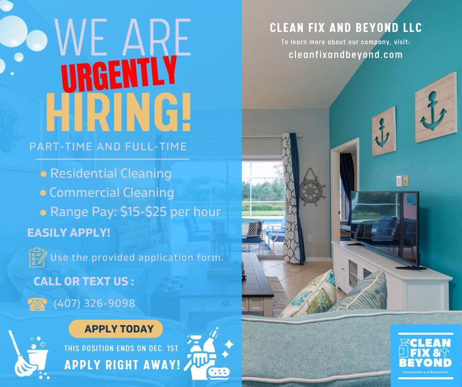 NOW HIRING — CLEANING TECHNICIANS - Clean Fix & Beyond LLC - Click HERE for the job description