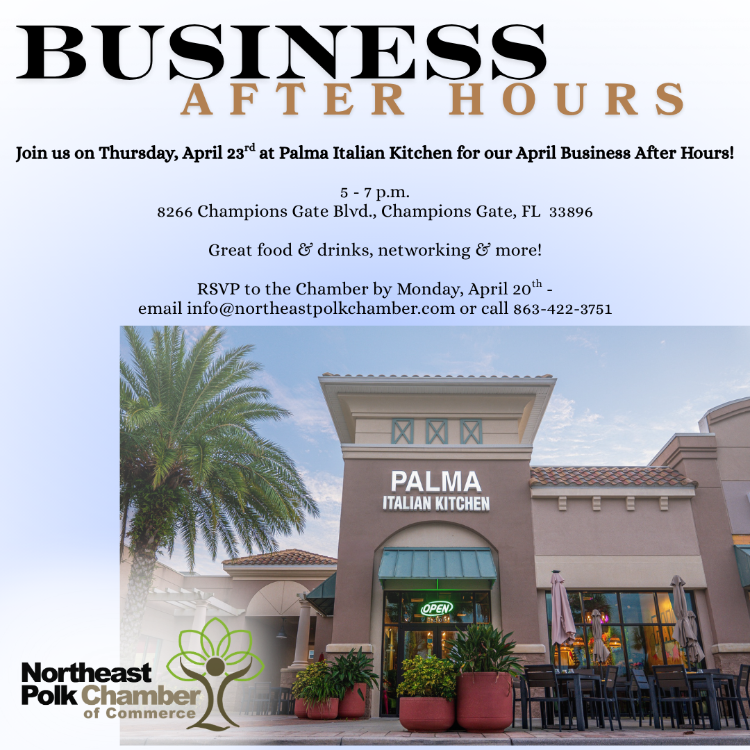 Join the Chamber on Thursday, April 23rd at Palma Italian Kitchen for our April Business After Hours!