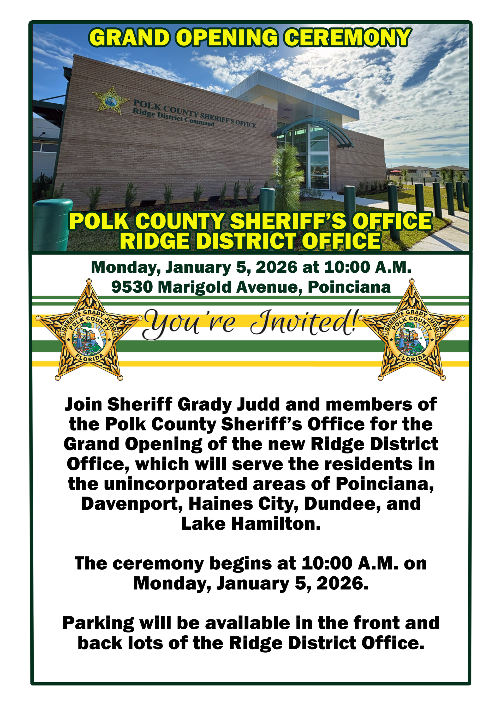 Join Sheriff Grady Judd & members of the Polk County Sheriff's Office for the Grand Opening of the new Ridge District Office, which will serve the residents in the unincorporated areas of Poinciana, Davenport, Haines City, Dundee, & Lake Hamilton. Parking will be available in the front and back lots of the Ridge District Office.